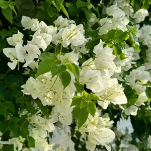 Bougenville putih dikenal karena bunga putihnya yang elegan dan bersih. Tanaman ini menciptakan suasana yang tenang dan menyegarkan di taman. Meskipun perawatannya sedikit lebih rumit dibandingkan jenis lainnya, bougenville putih tetap memberikan keindahan yang timeless dan menambah kesan klasik di ruang luar.