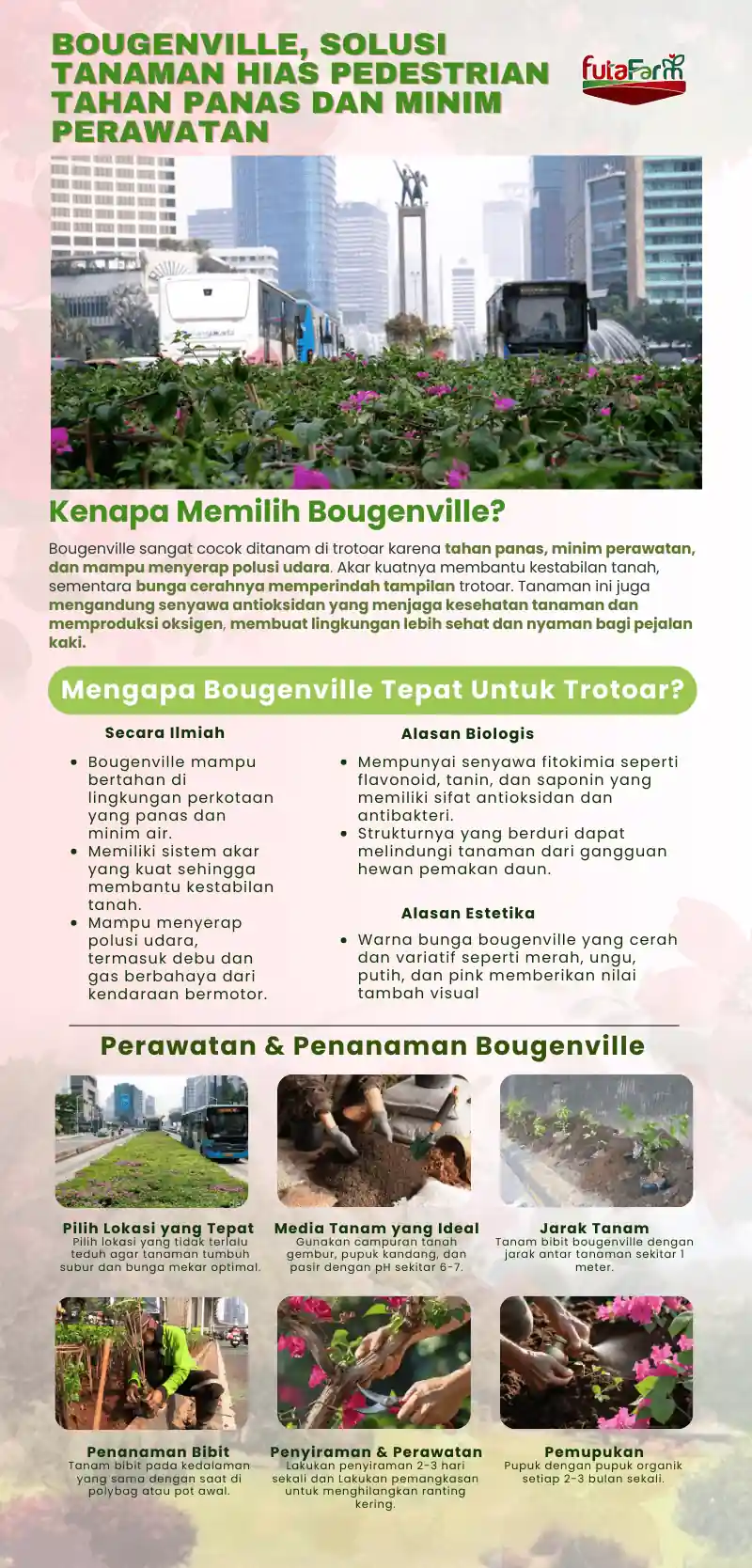 Keunggulan ini menjadikan bougenville pilihan tepat untuk penghijauan trotoar, selain menambah keindahan visual dan kenyamanan pengguna jalan.